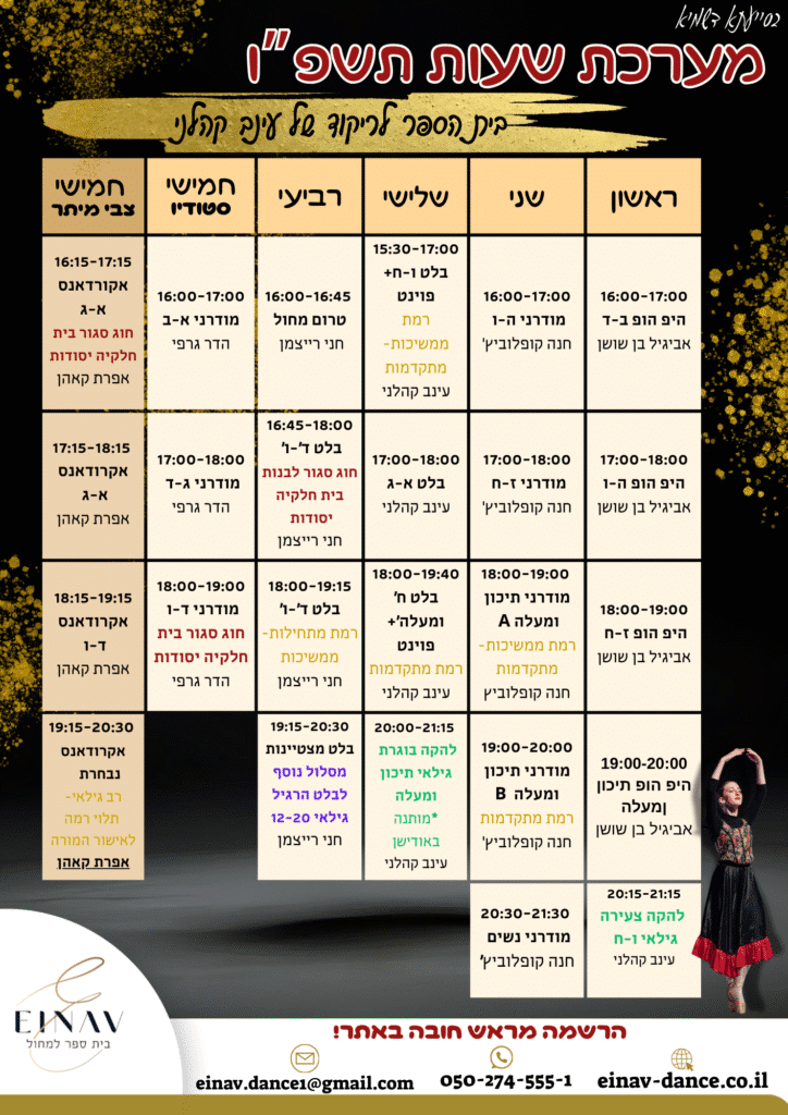 בית הספר למחול של עינב הינו ייחודי ושונה בנוף הישראלי, הוא עונה על הצורך של בנות ונשים דתיות להשתלב בעולם המחול תוך שמירה על עולם הערכים שלהם. אנו מציעים מגוון רחב של שיעורי ריקוד מקצועיים ביותר עם רצון ושאיפה לקדם כל בת ובת ומנגד ללא התפשרות על טהרת החינוך והצניעות.